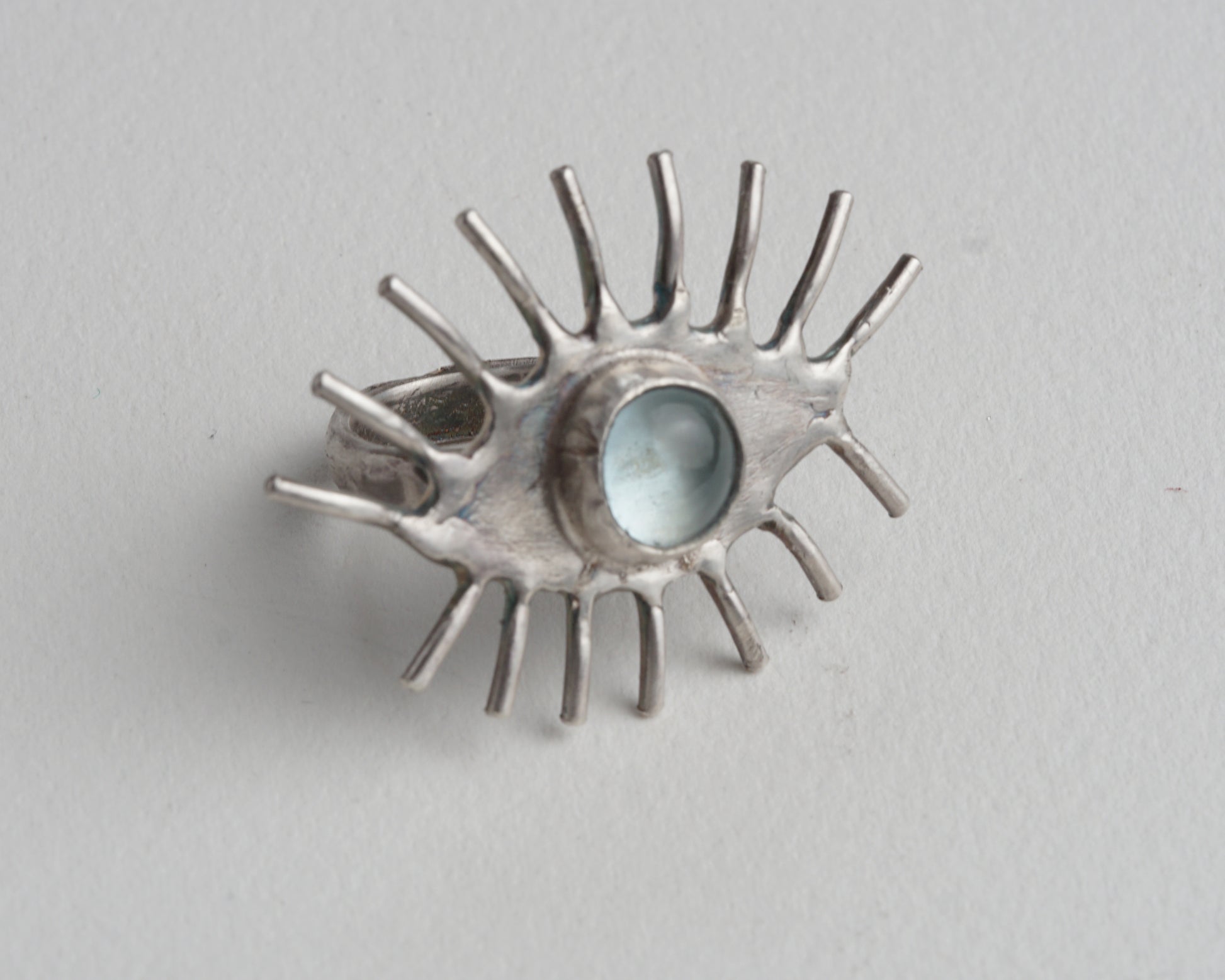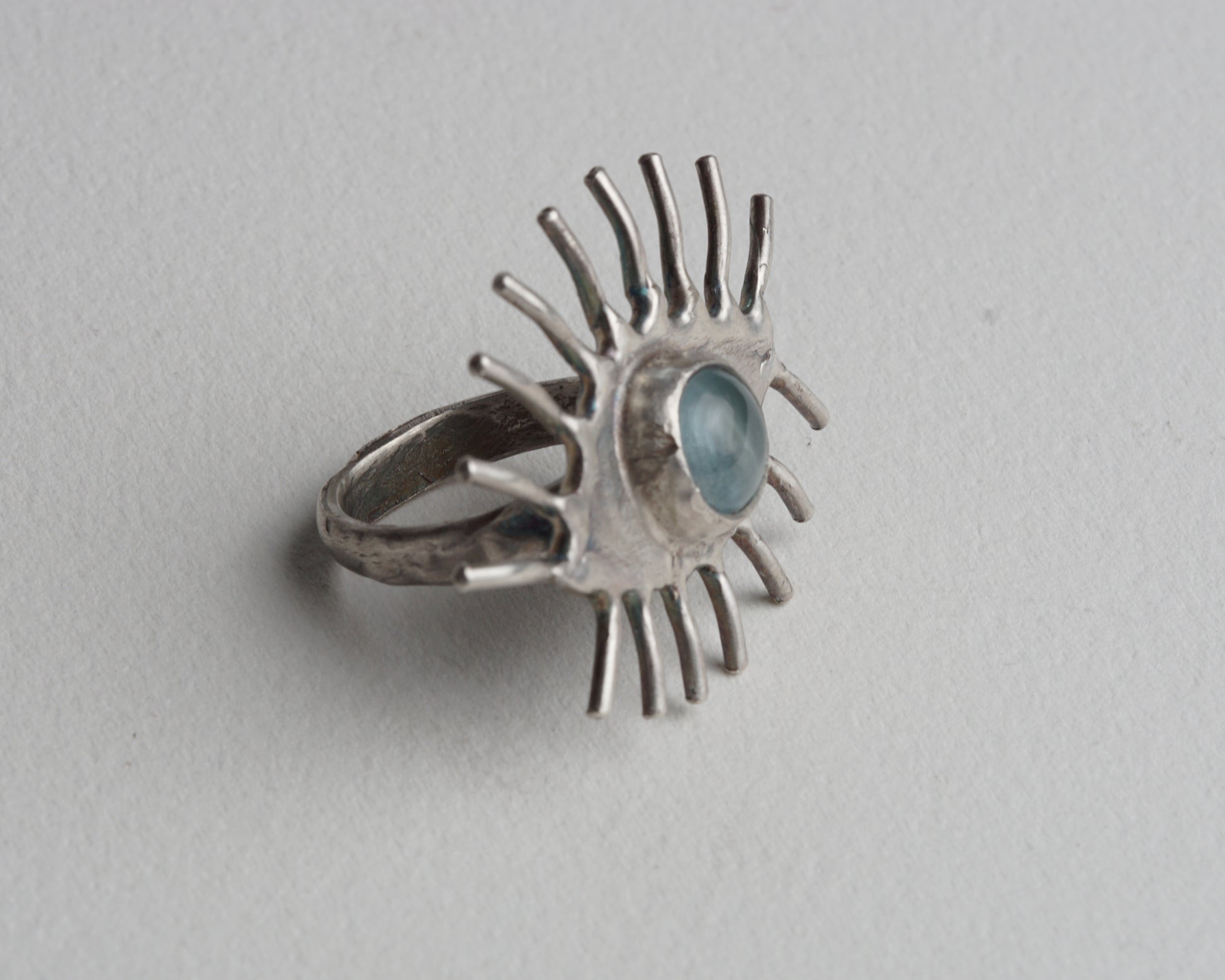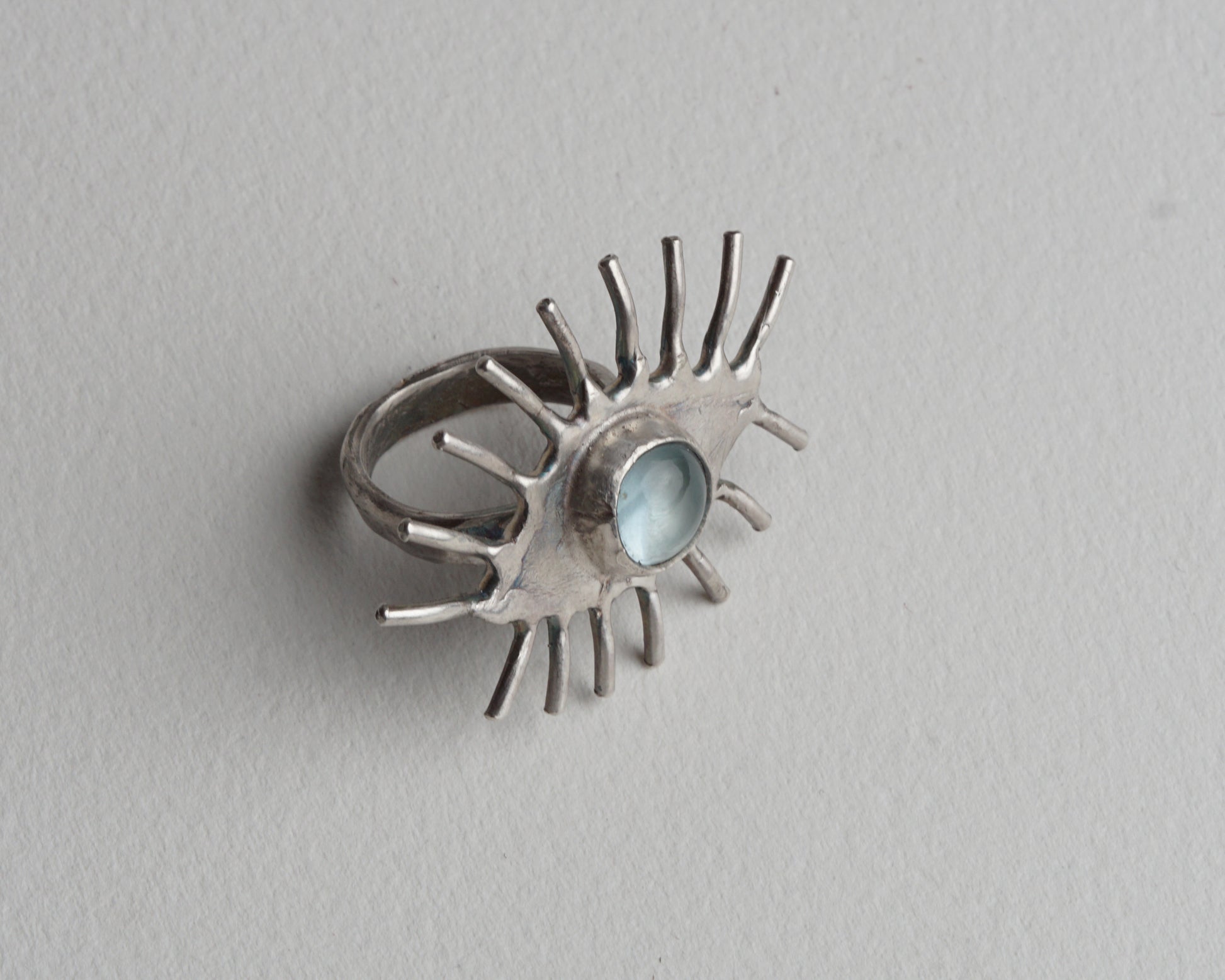 Handcrafted eye-shaped ring featuring a genuine aquamarine at its center. The detailed design creates a striking focal point. Made from pure silver for lasting quality and subtle shine.