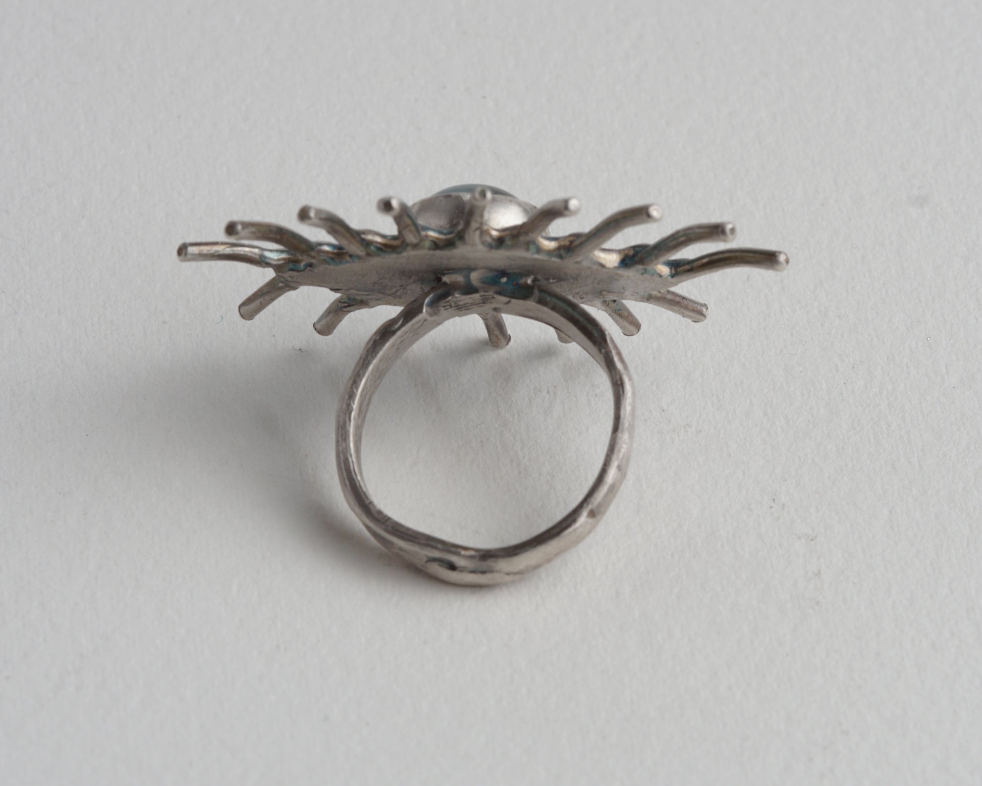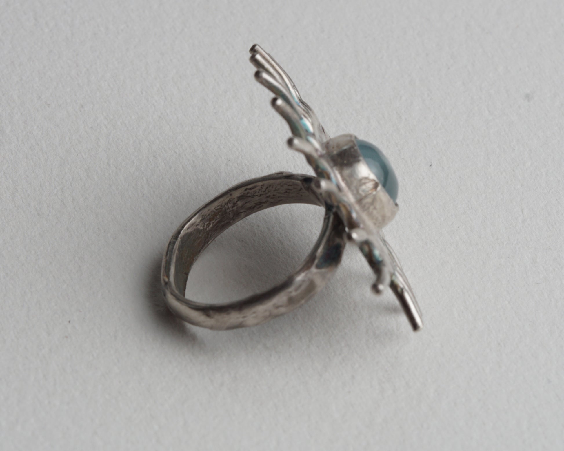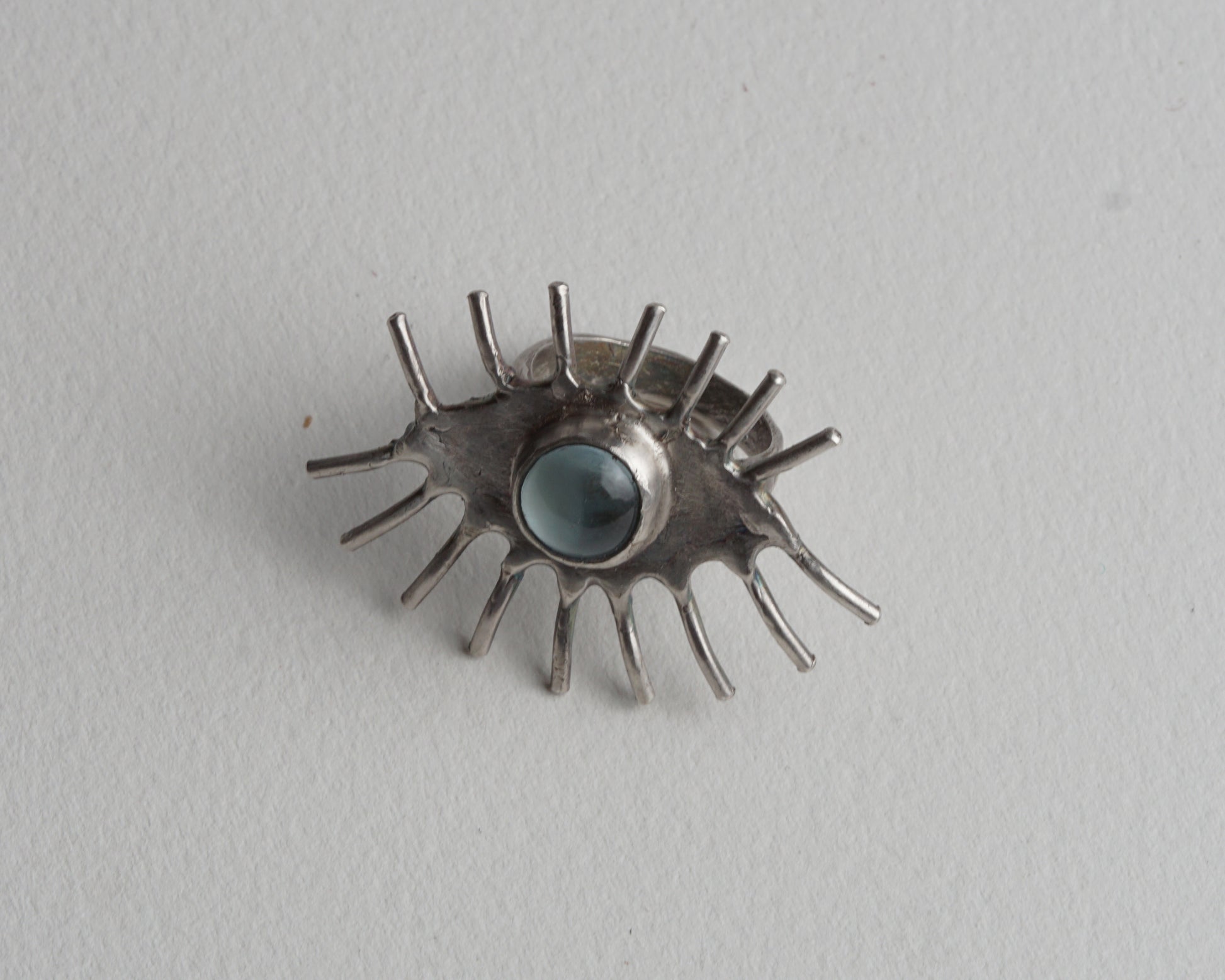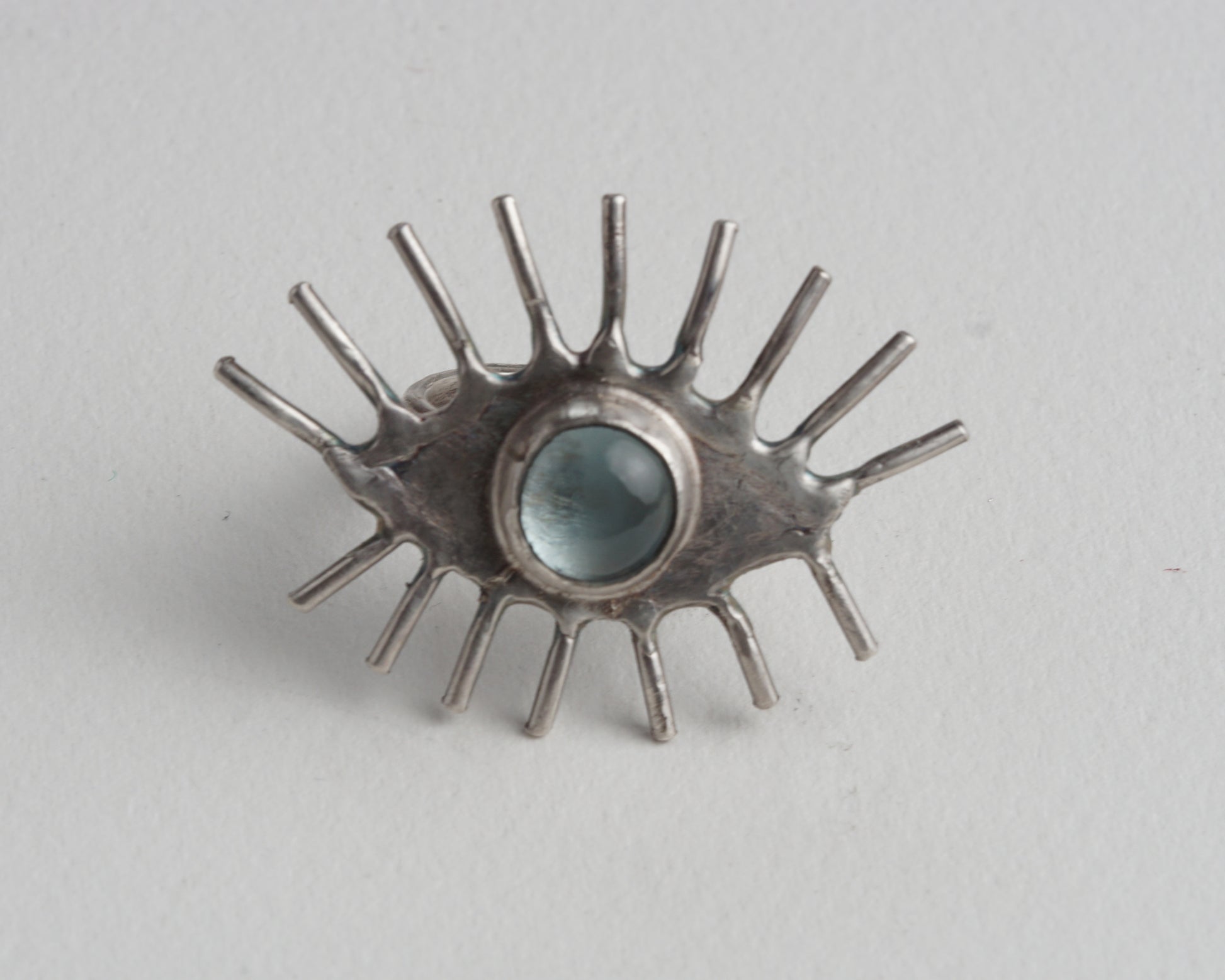 Handcrafted eye-shaped ring featuring a genuine aquamarine at its center. The detailed design creates a striking focal point. Made from pure silver for lasting quality and subtle shine.