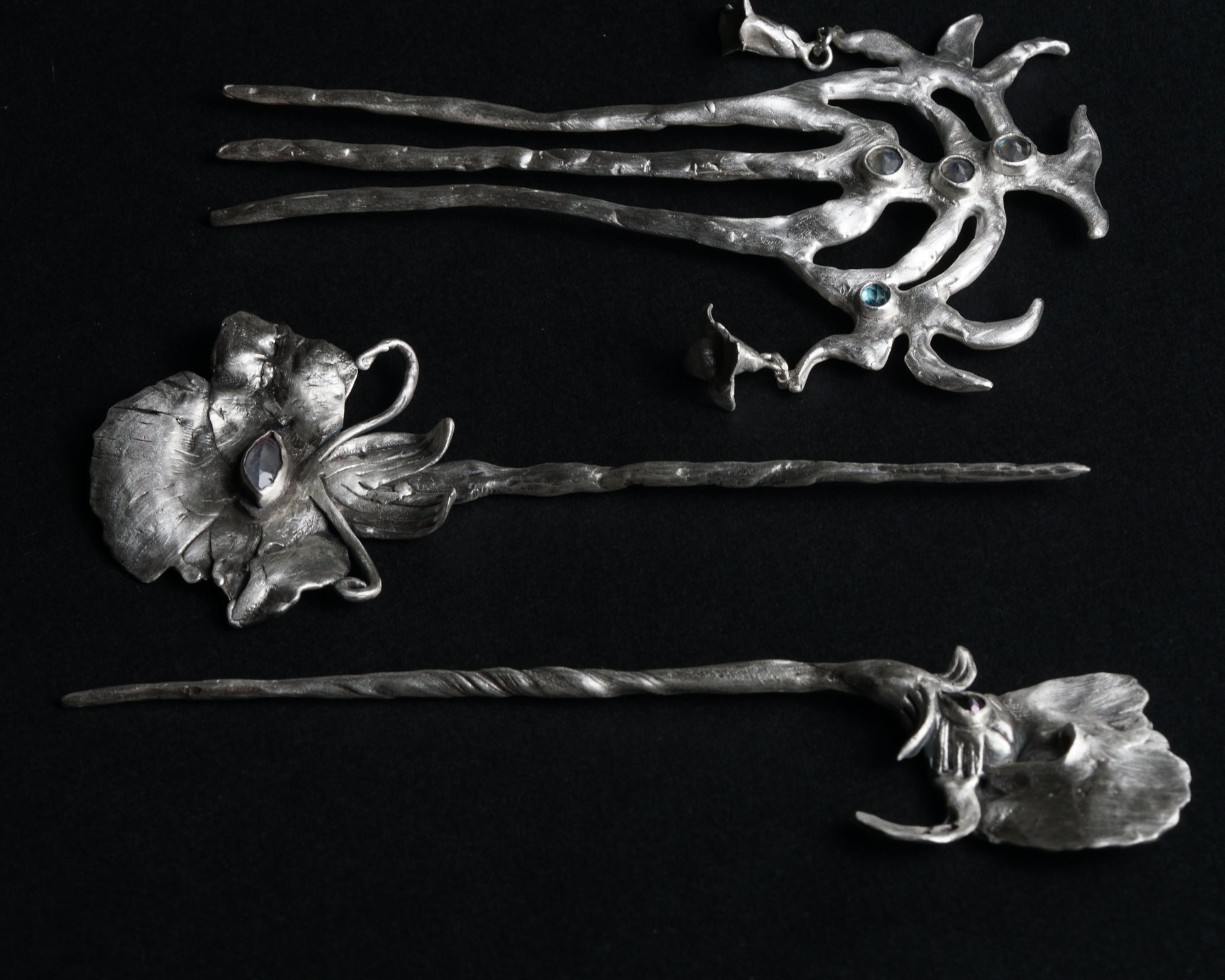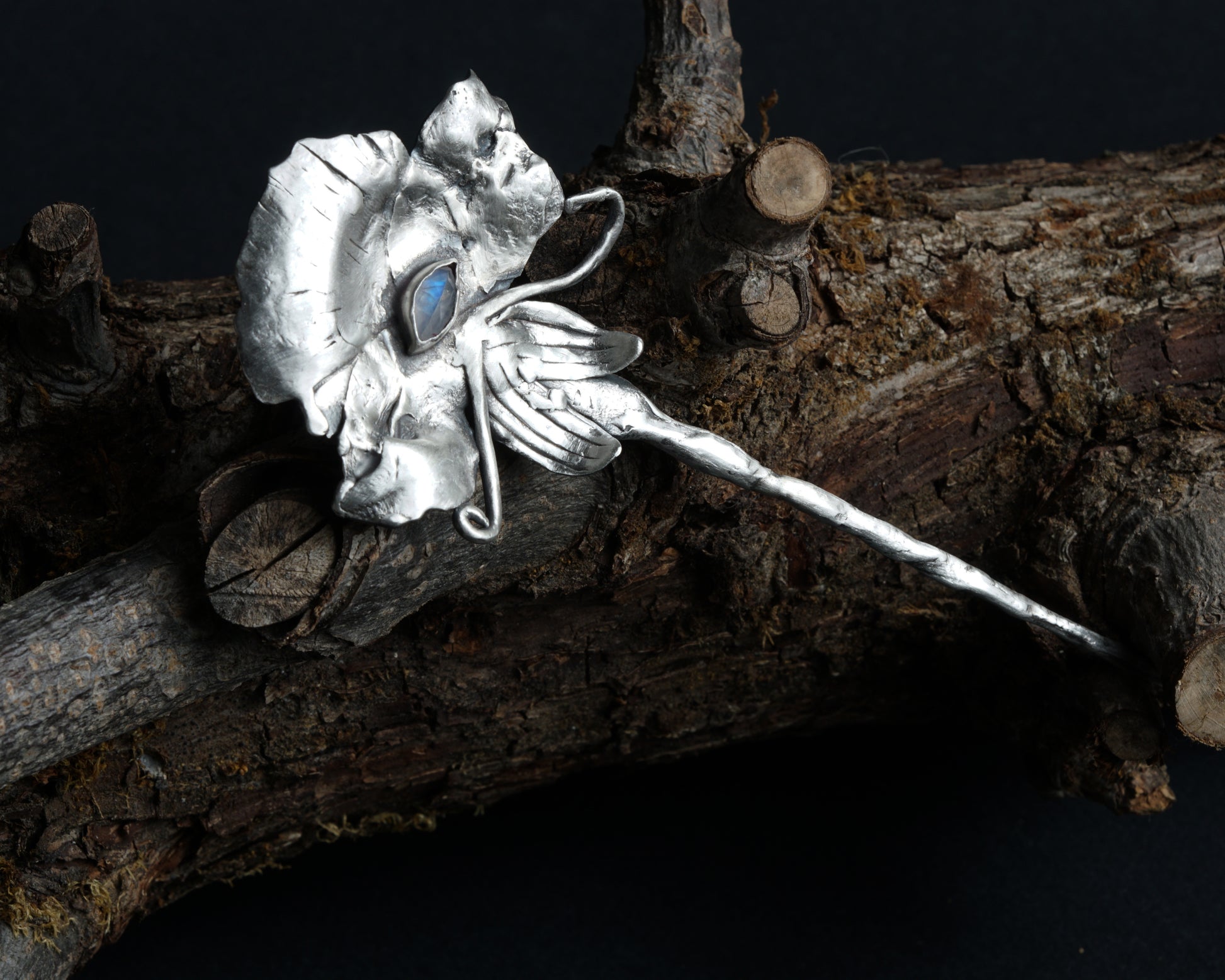 A fairytale-inspired hair pin handcrafted from 925 sterling silver. Shaped like an enchanted flower, it holds a natural moonstone at its center, glowing with soft, mystical light.
