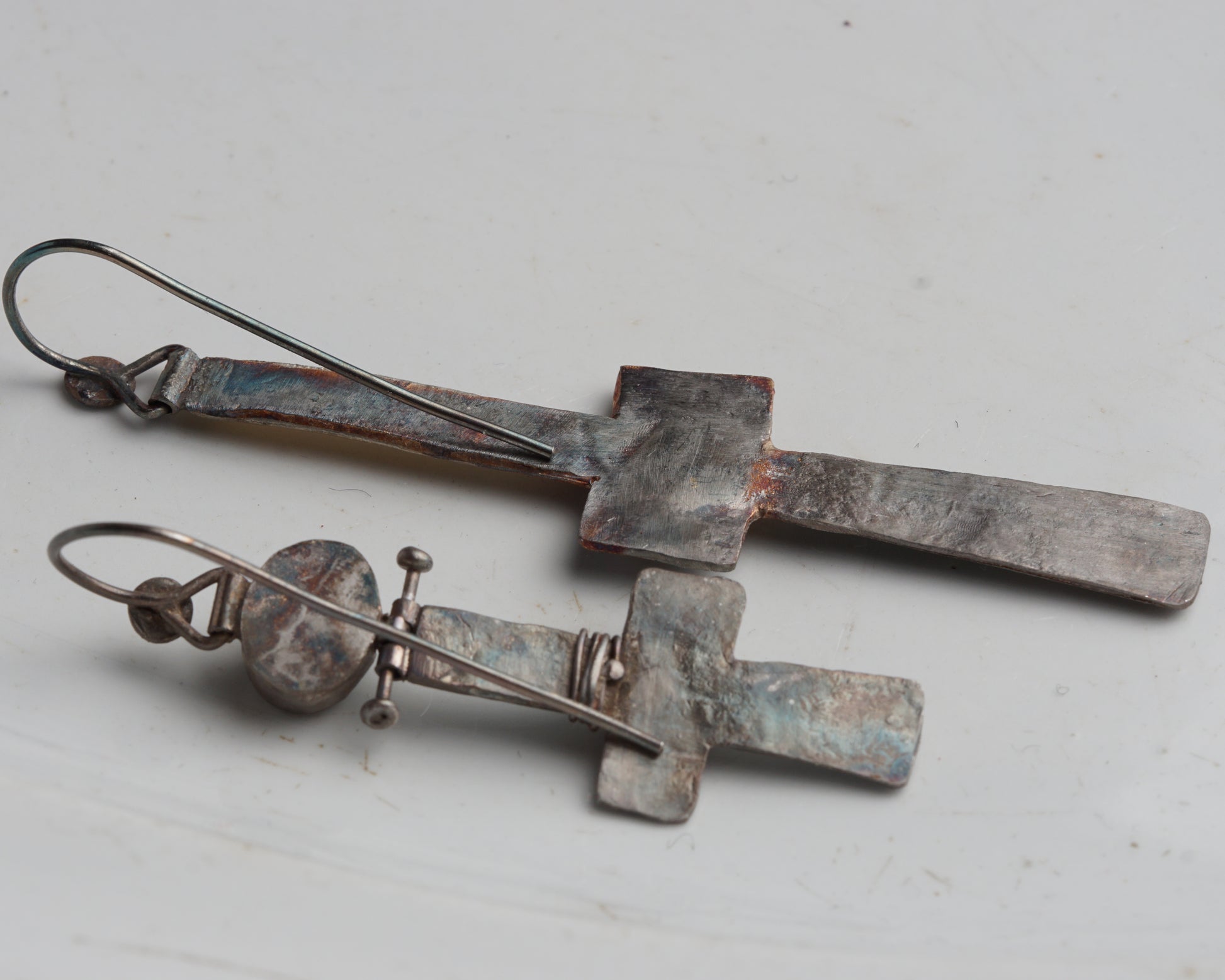 A pair of earrings made from oxidized silver, partially coated with 14k gold, with additional 14k gold details. Baroque pearls, garnet, and a small turquoise complete the design, making each pair one of a kind.