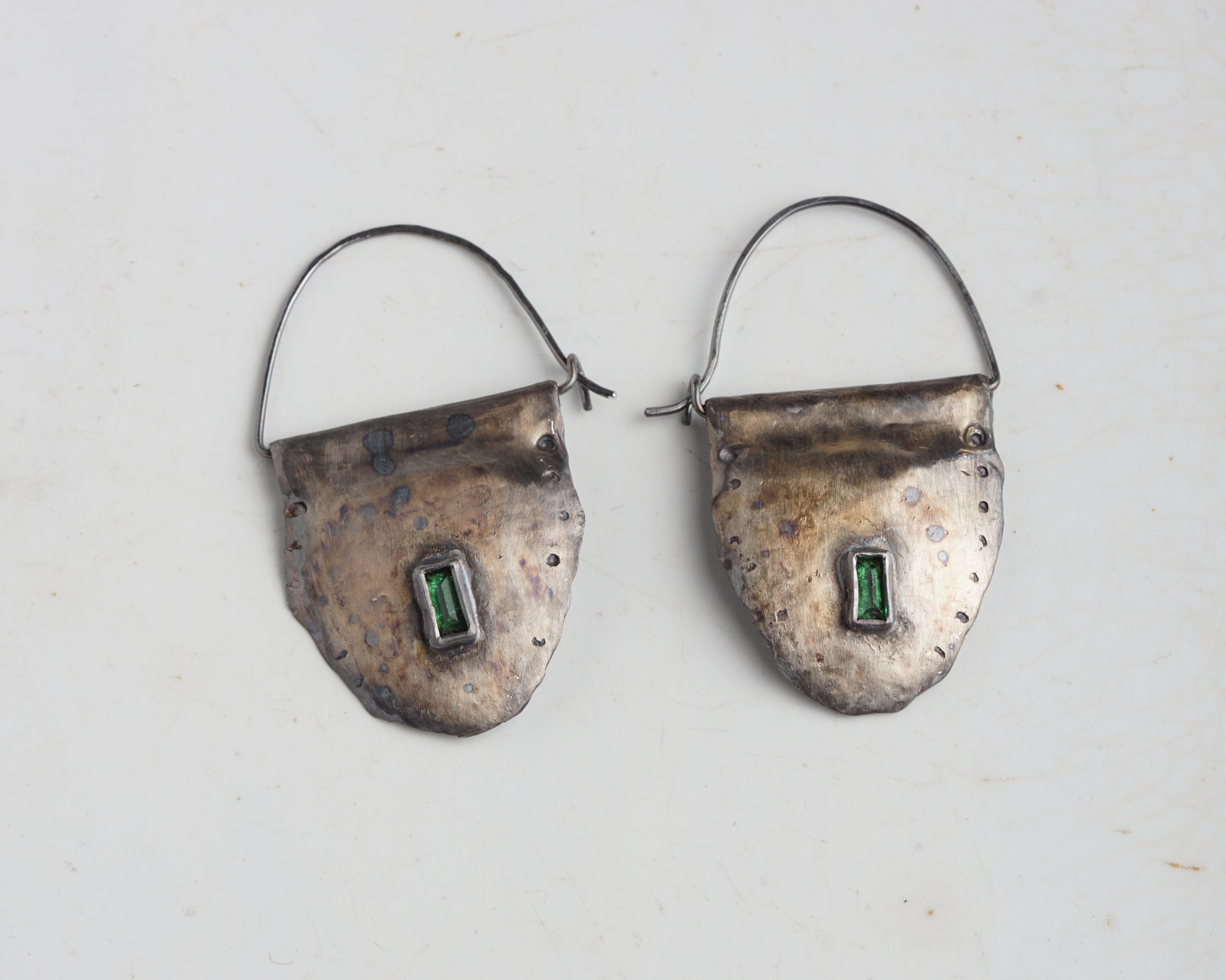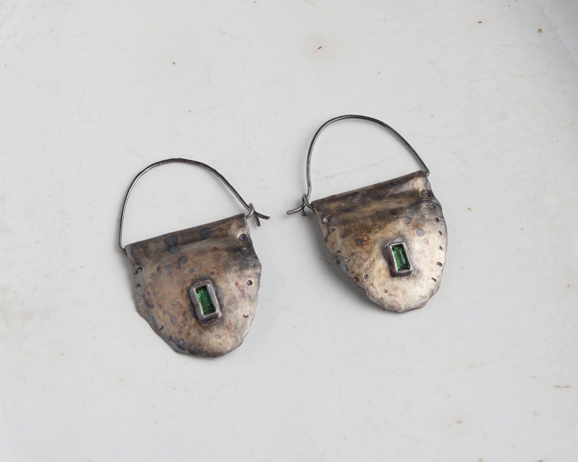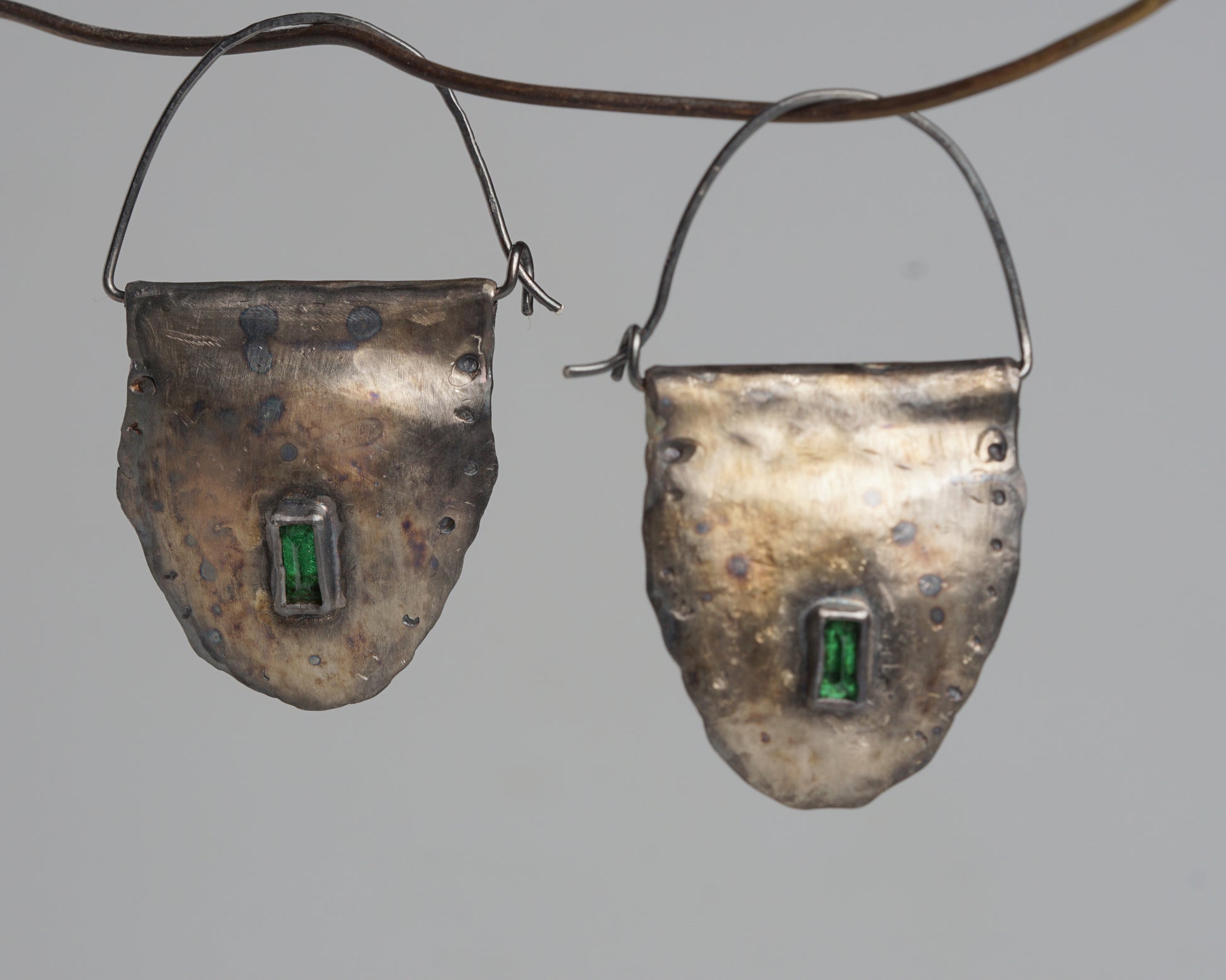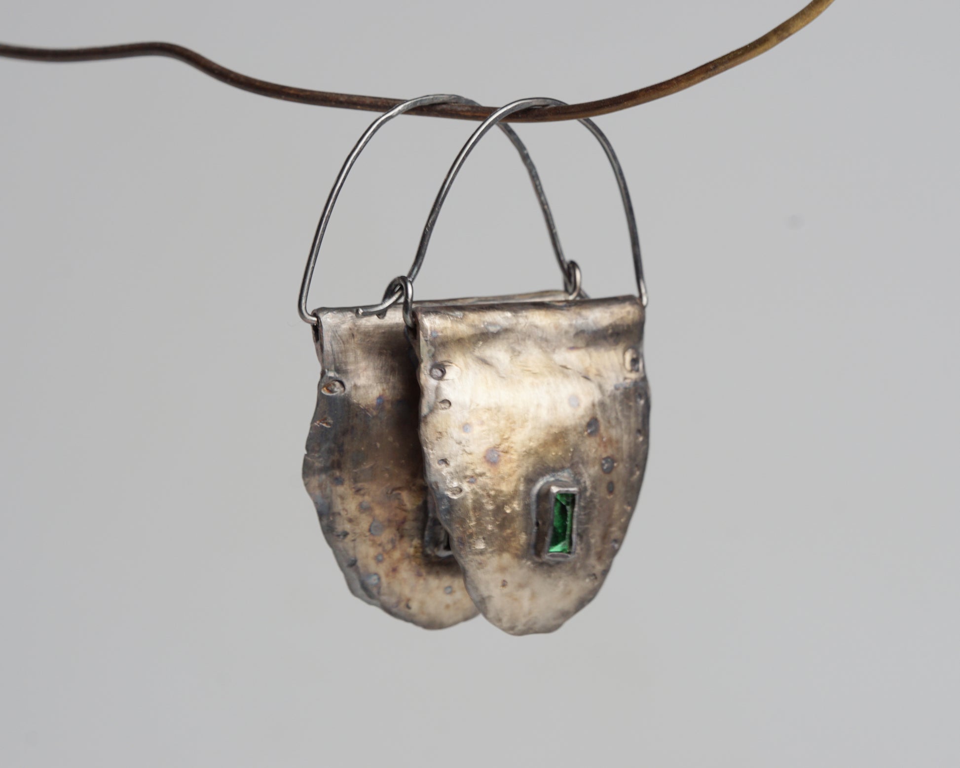 Hand-forged silver earrings with alpanite inlays. Oxidized and finished with a golden patina. The surface has a rich, textured character.