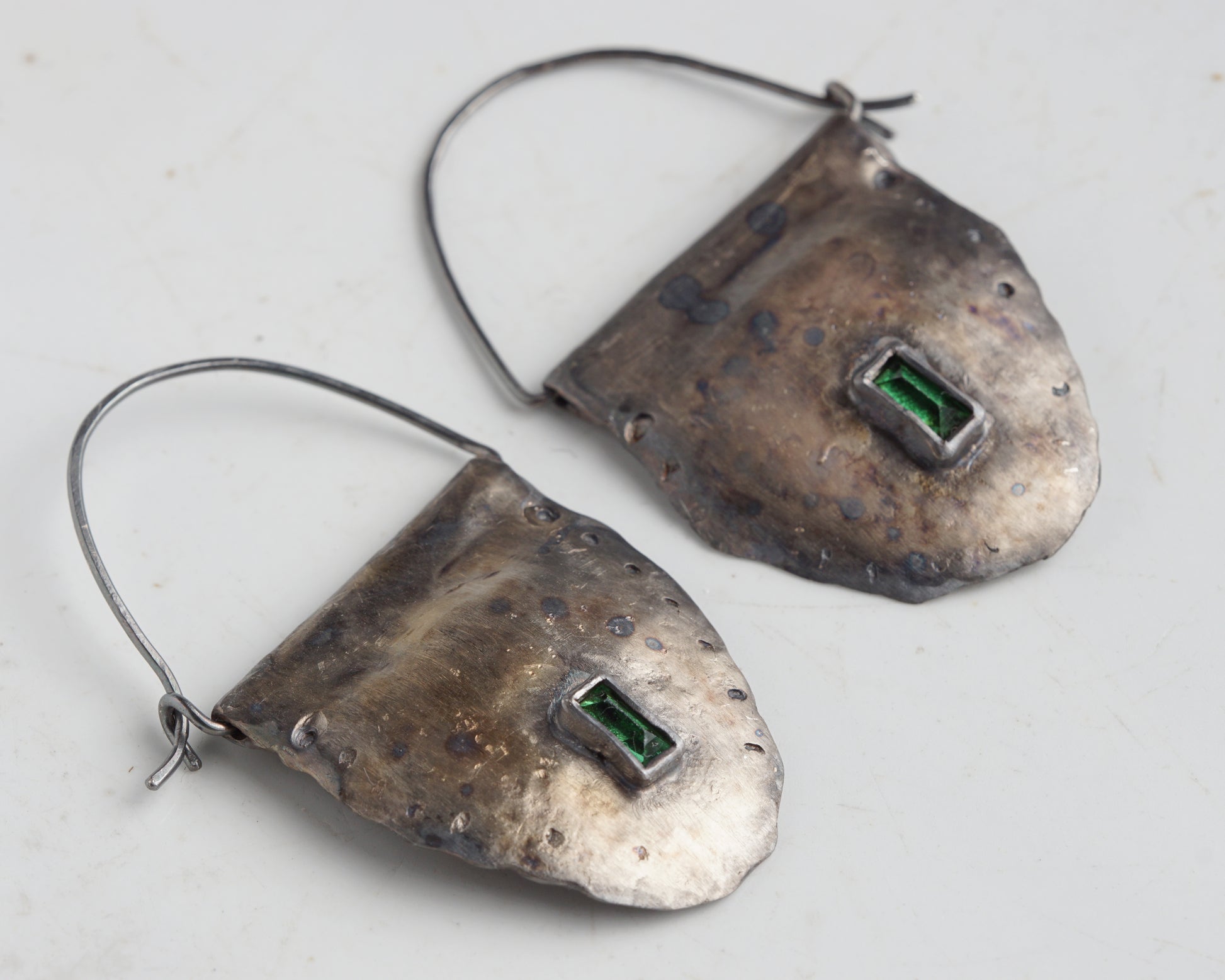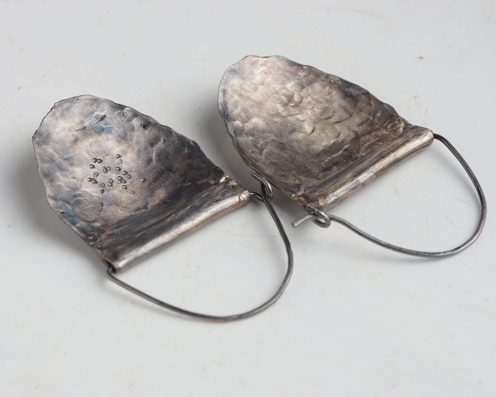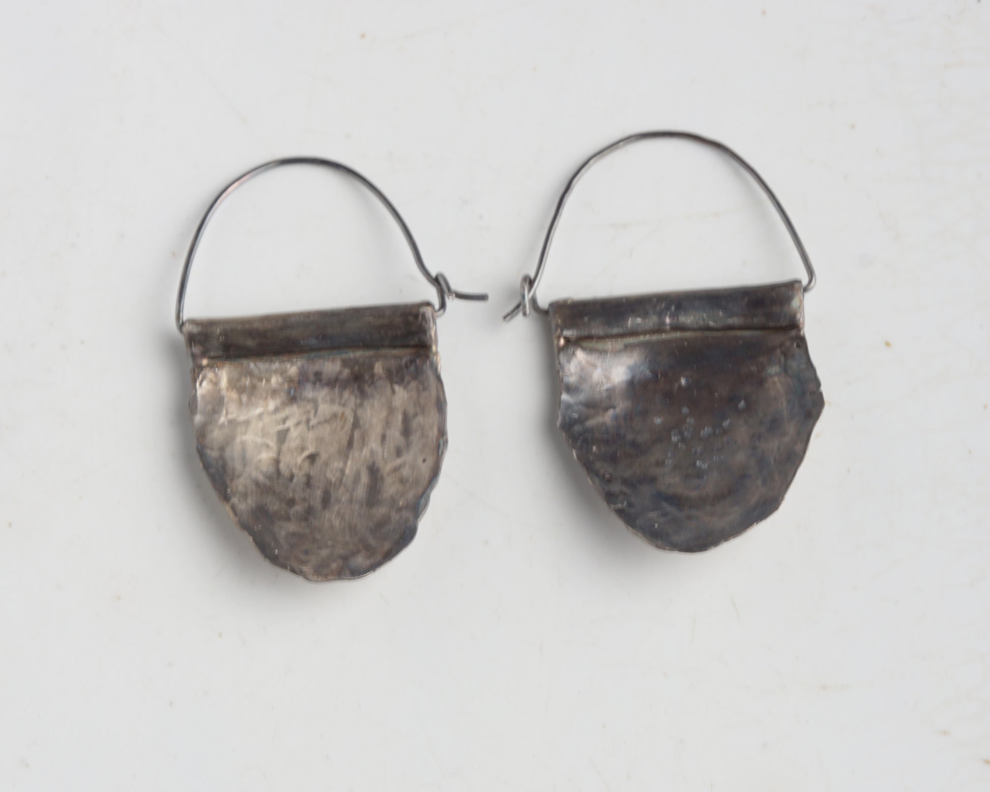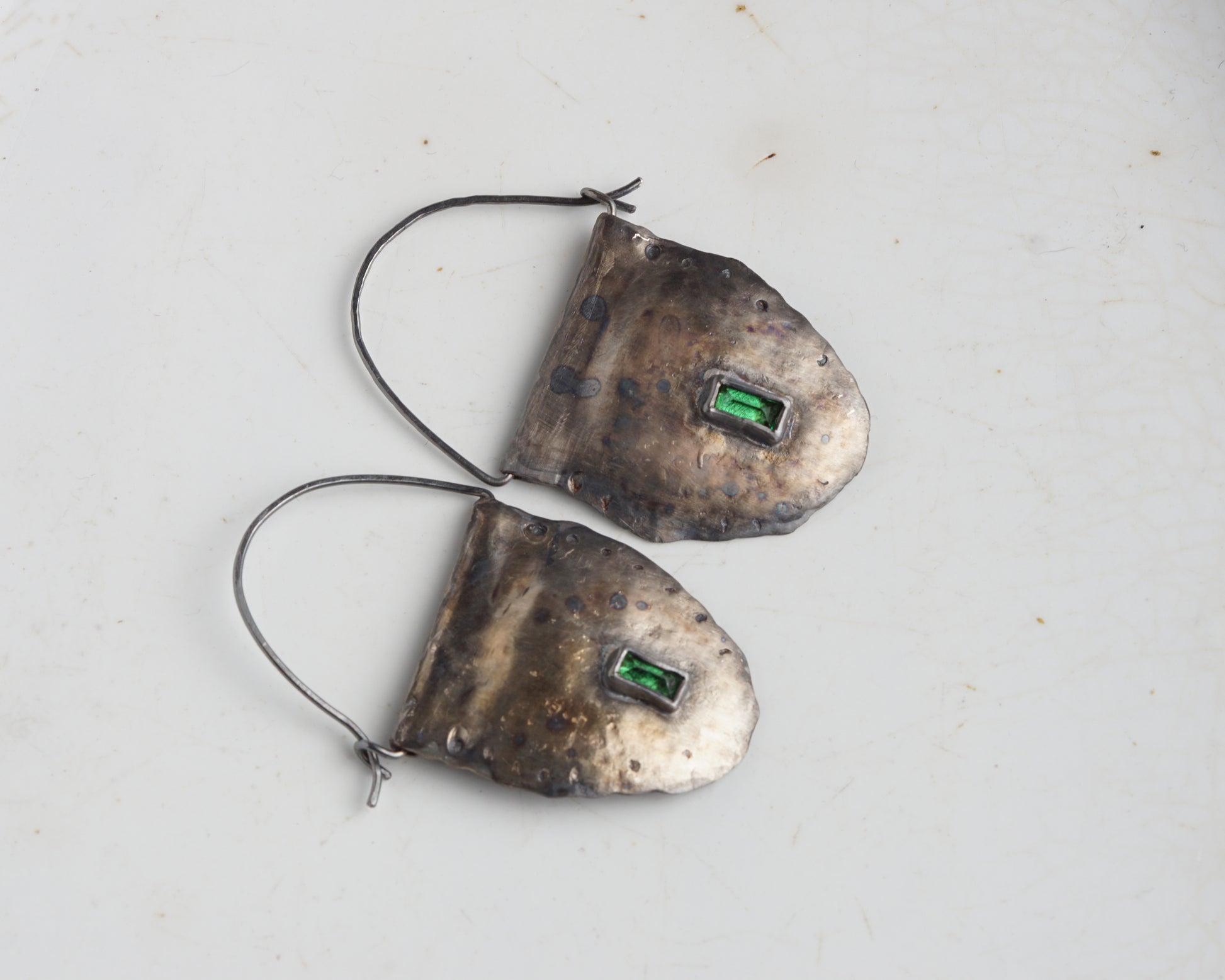 Hand-forged silver earrings with alpanite inlays. Oxidized and finished with a golden patina. The surface has a rich, textured character.