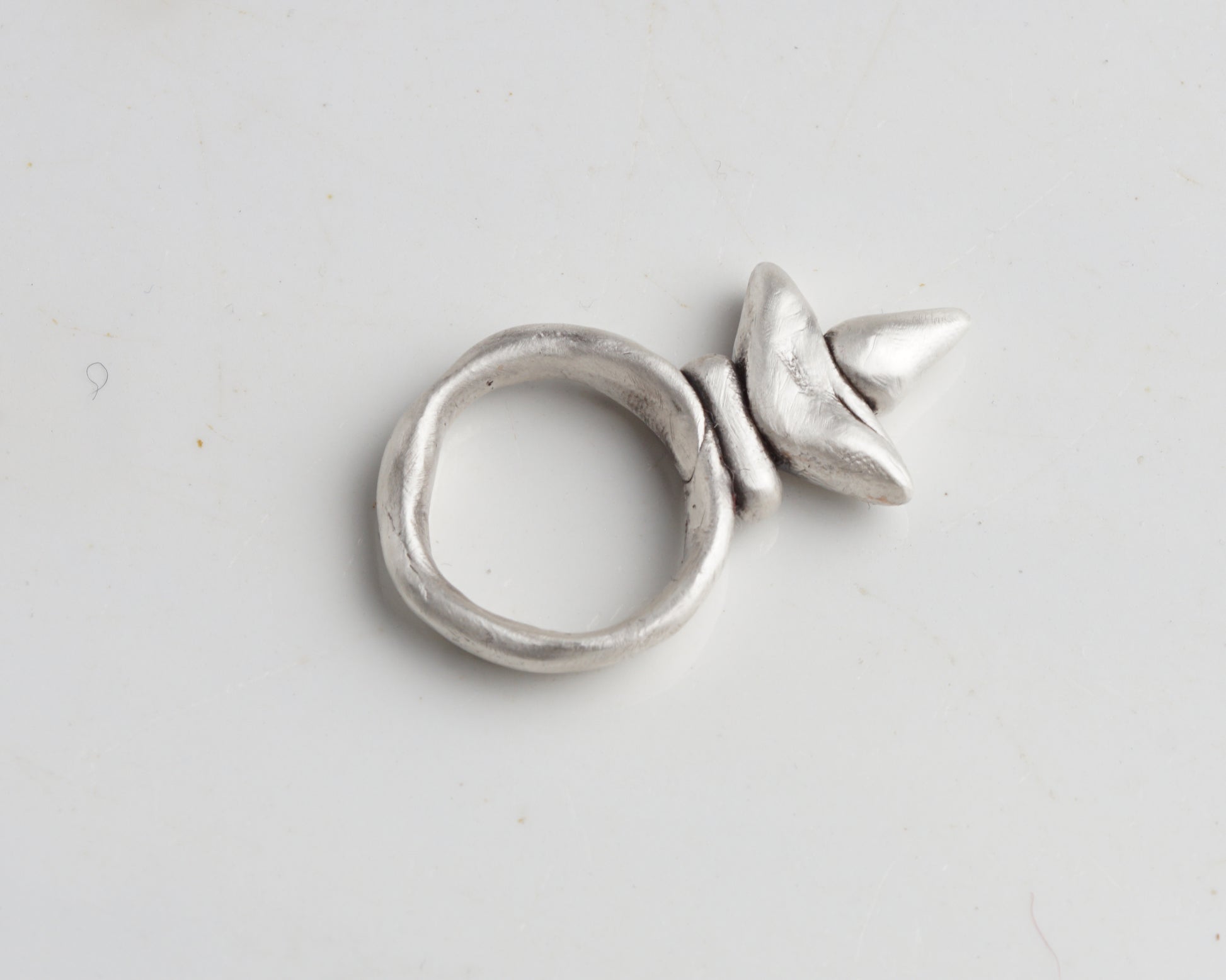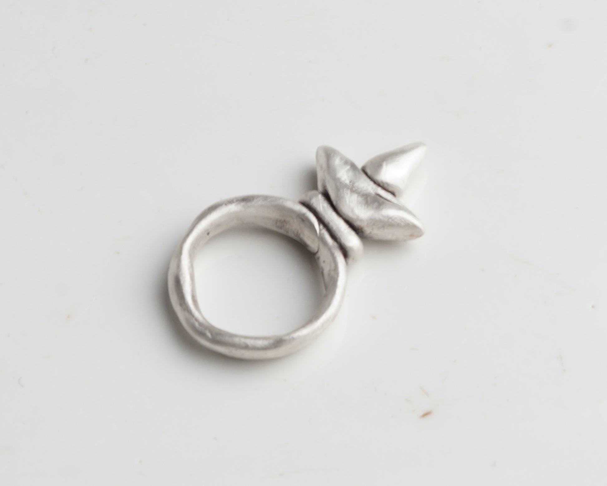 This ring is made to order. Production time: 12 business days.  A massive, sculptural silver ring with a distinctive pointed form. Its textured surface and raw volume emphasize the handmade nature of the piece, creating an expressive and bold silhouette.
