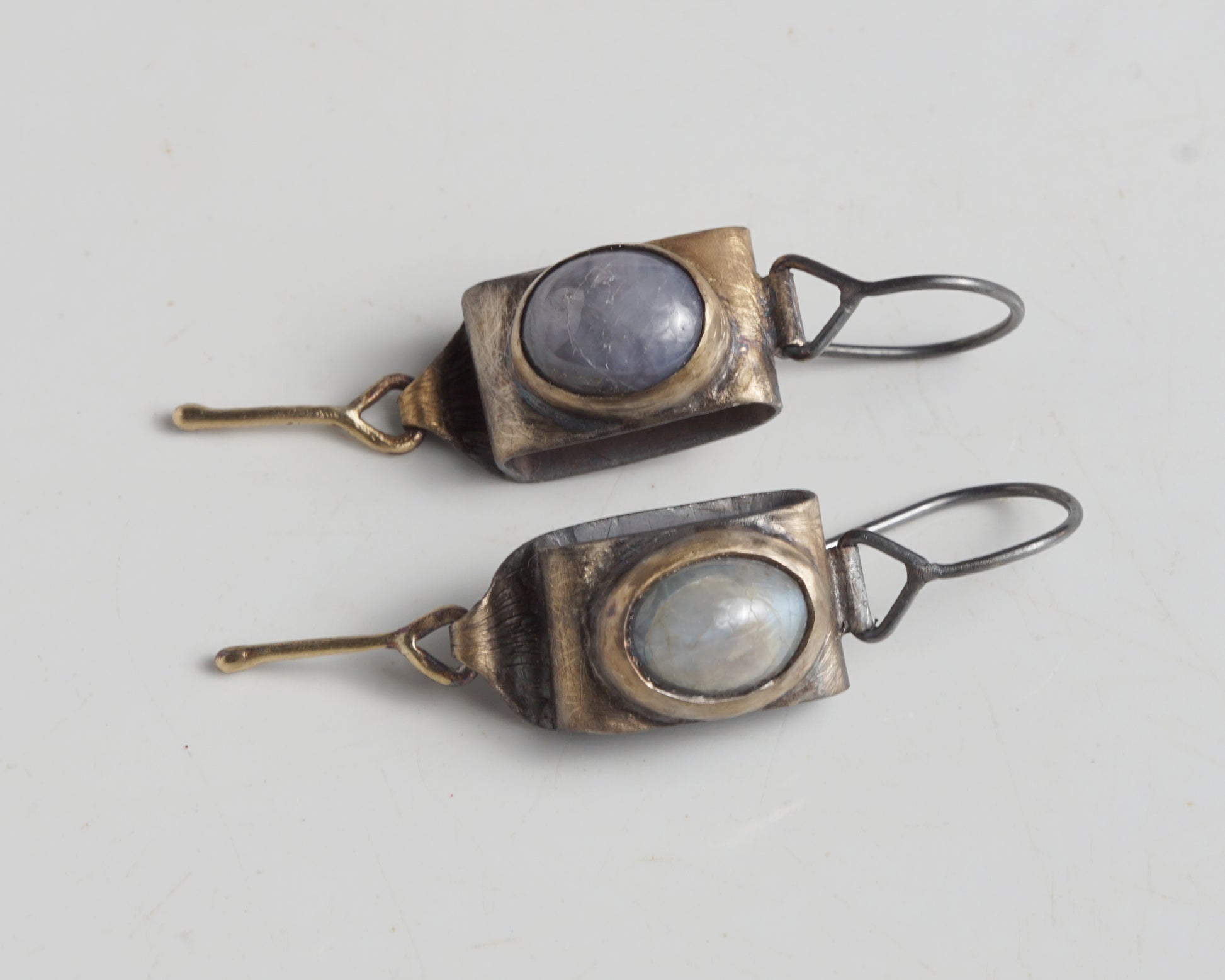 Handcrafted earrings featuring Sapphire and Moonstone. The earrings are partially covered with an 18k gold patina and finished with 18k gold dangle accents.