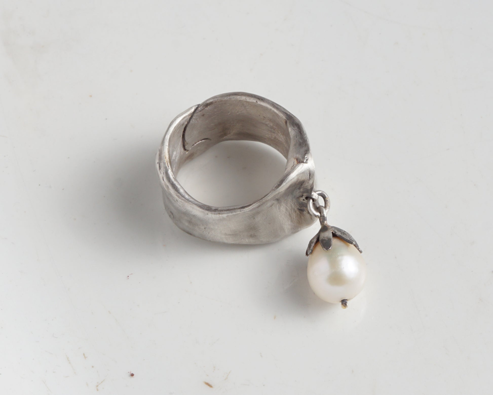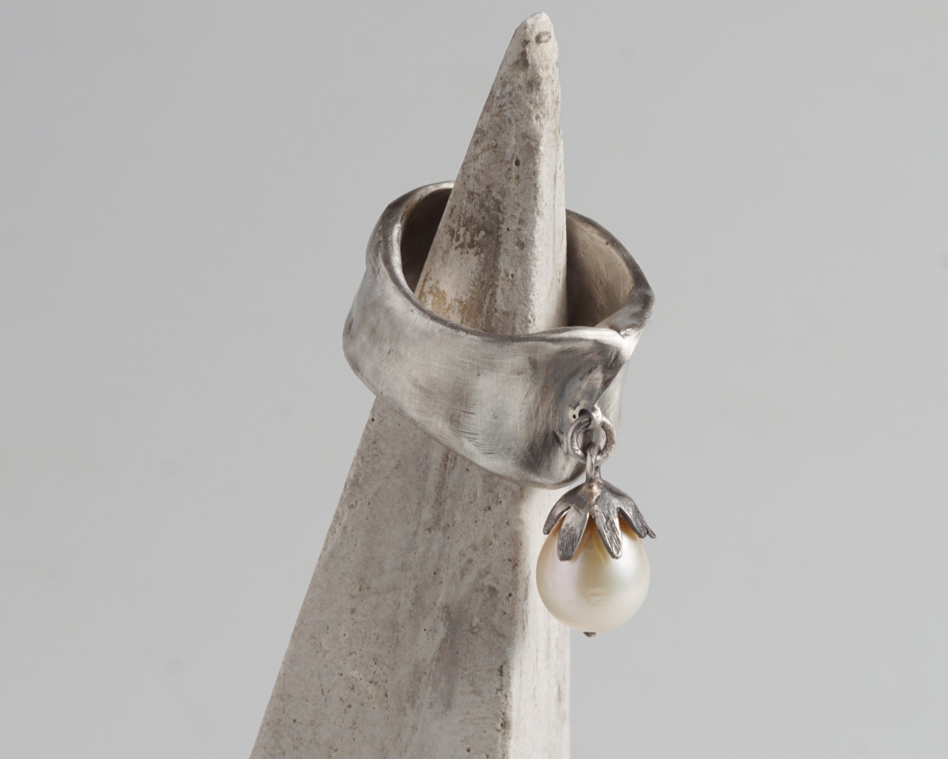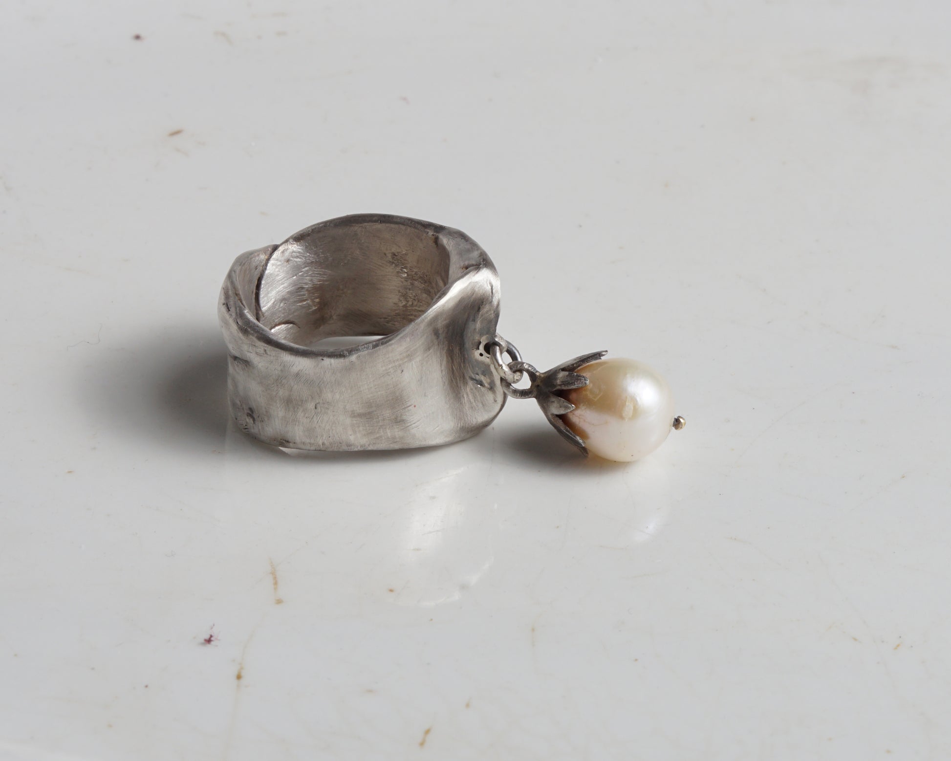 This ring features a natural, organic shape with a wide, textured band. It is accented by a pendant containing a large, lustrous pearl that hangs freely from the setting.