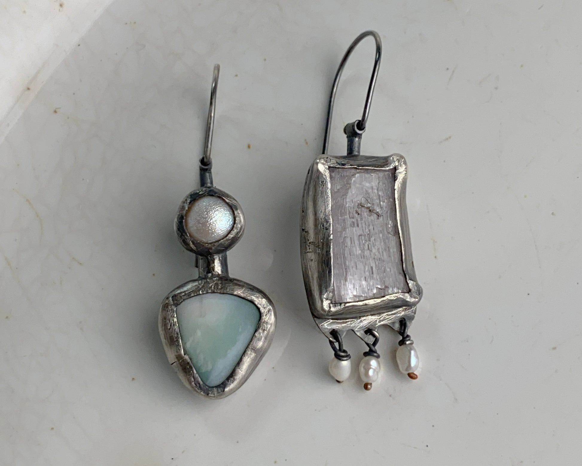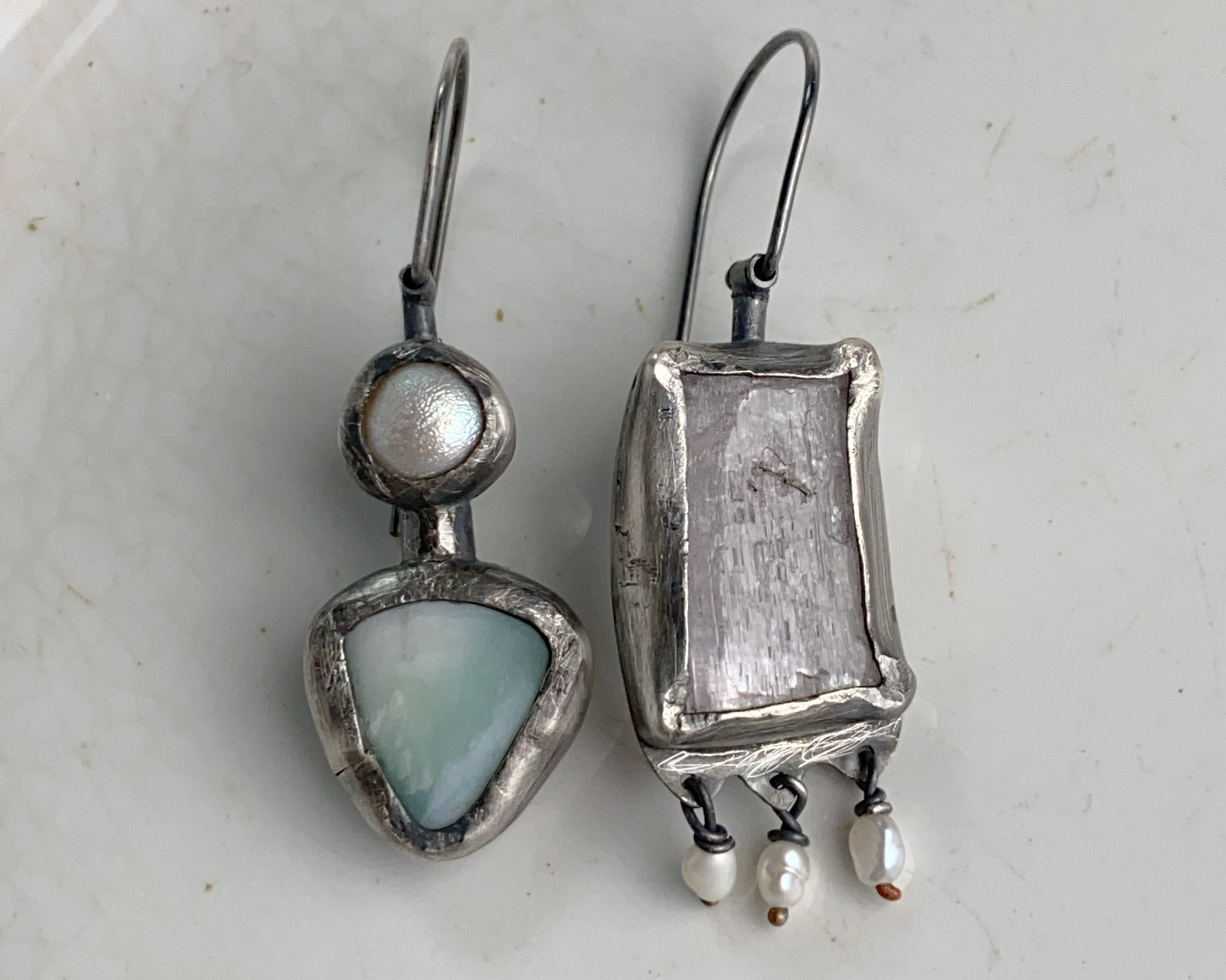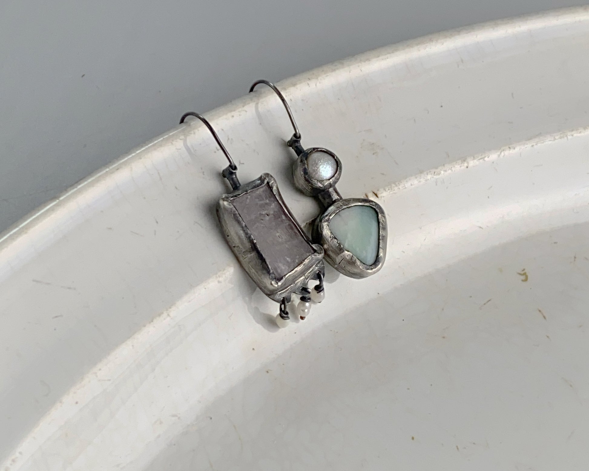 This pair of mismatched earrings features distinct designs: one earring showcases a small, round chrysoprase and a triangular freshwater pearl set in a textured silver frame, while the other combines a rectangular rose quartz and three small pearls. Each stone and pearl is hand-set in sterling silver with a subtle tarnished finish. Both earrings are completed with handcrafted silver wire hooks for comfortable wear.