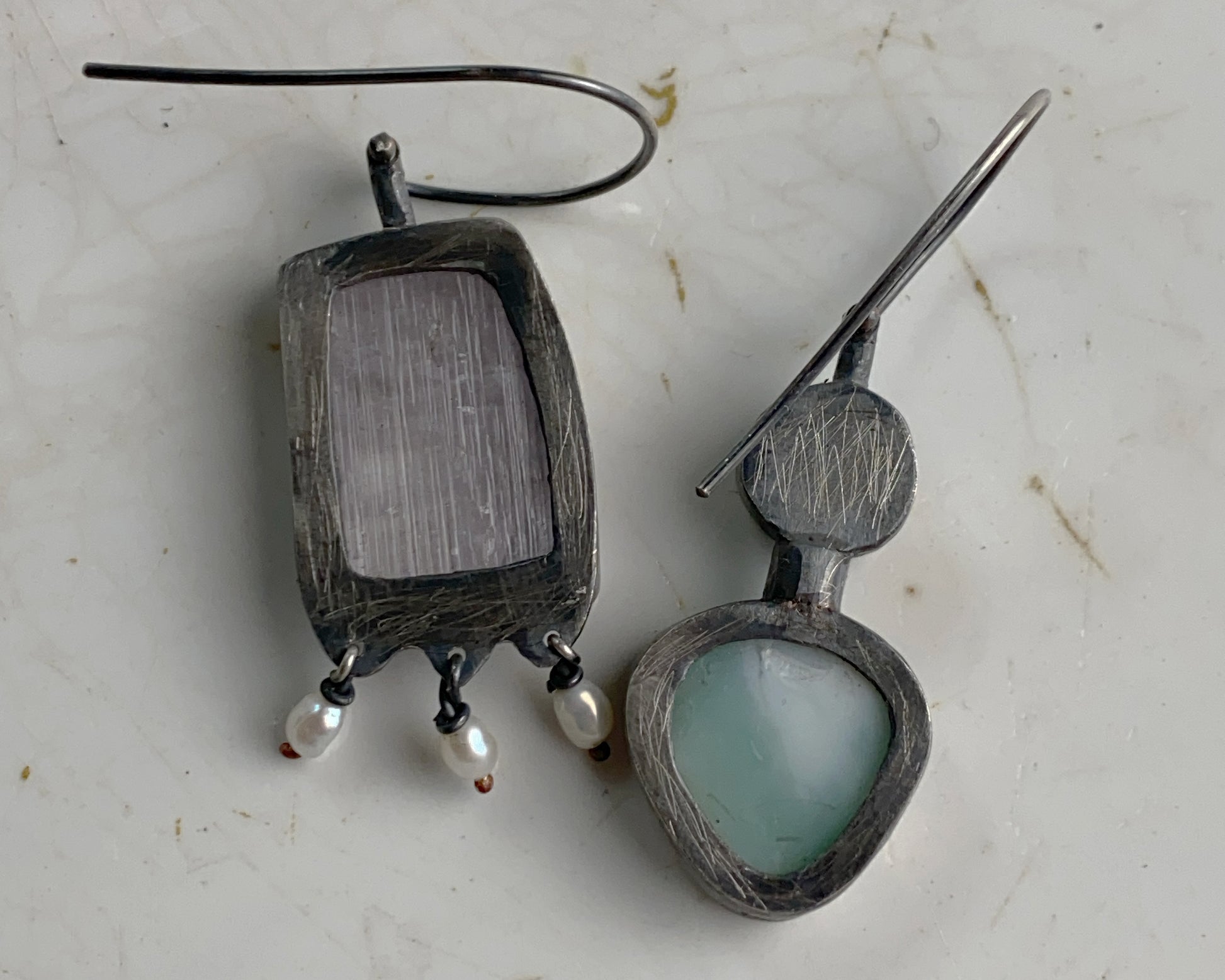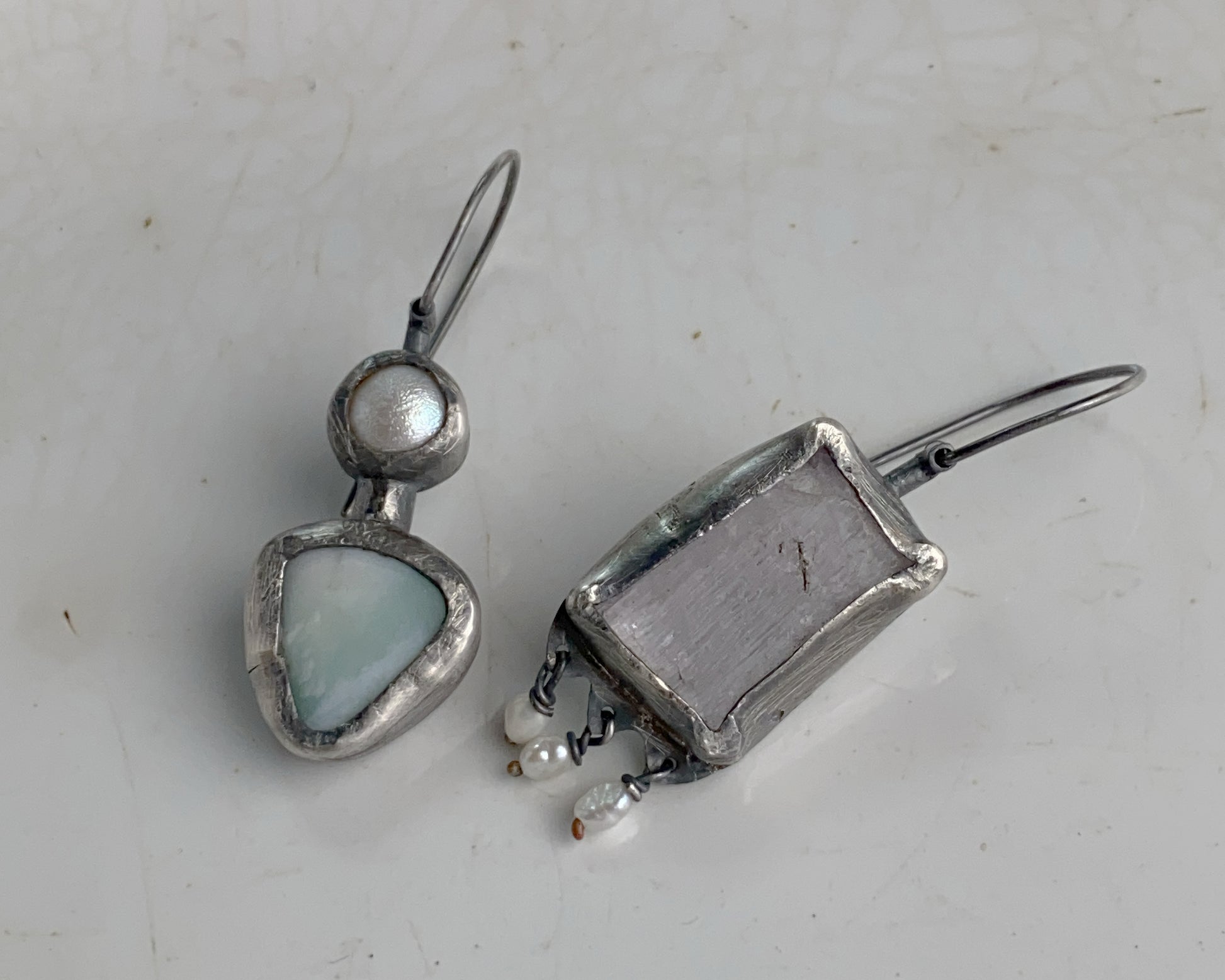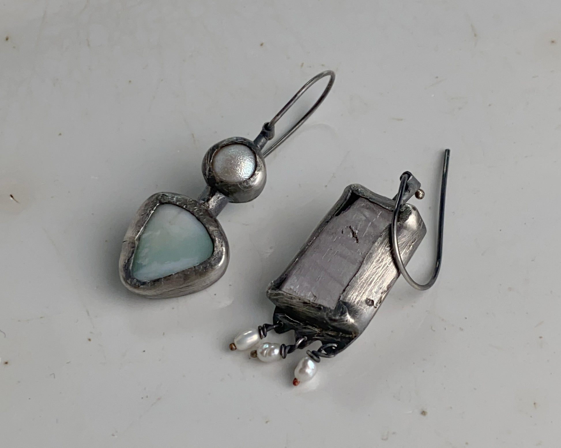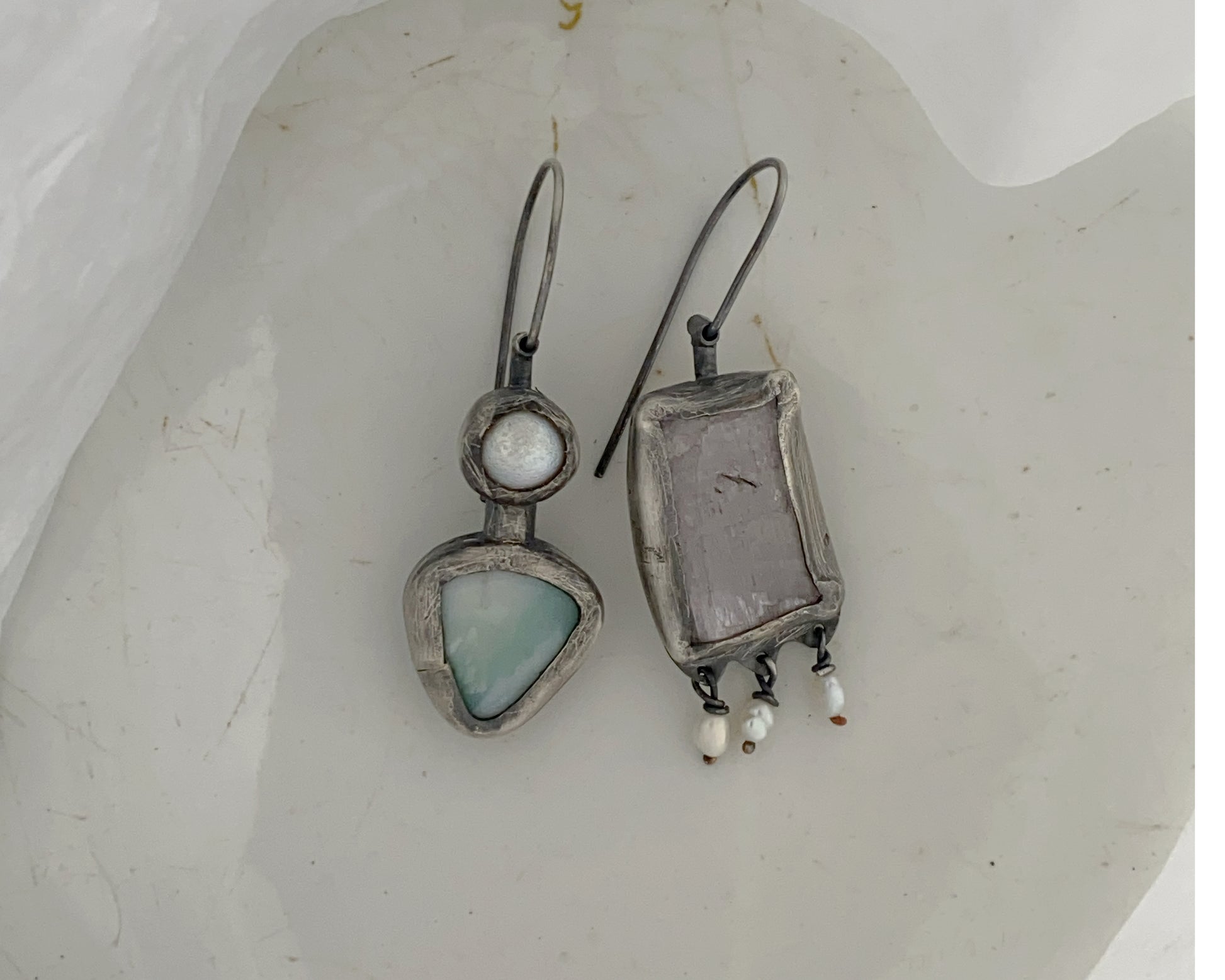 This pair of mismatched earrings features distinct designs: one earring showcases a small, round chrysoprase and a triangular freshwater pearl set in a textured silver frame, while the other combines a rectangular rose quartz and three small pearls. Each stone and pearl is hand-set in sterling silver with a subtle tarnished finish. Both earrings are completed with handcrafted silver wire hooks for comfortable wear.