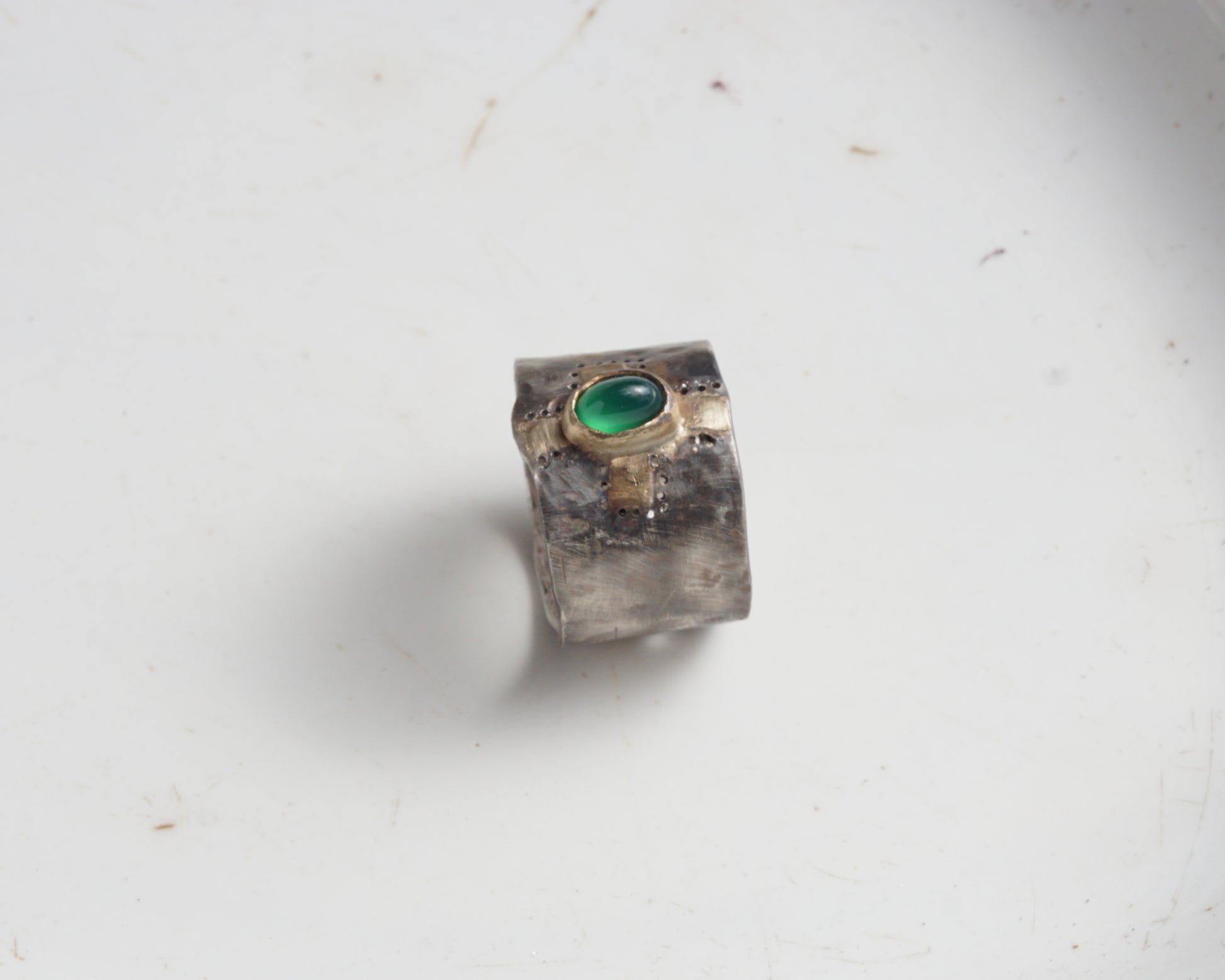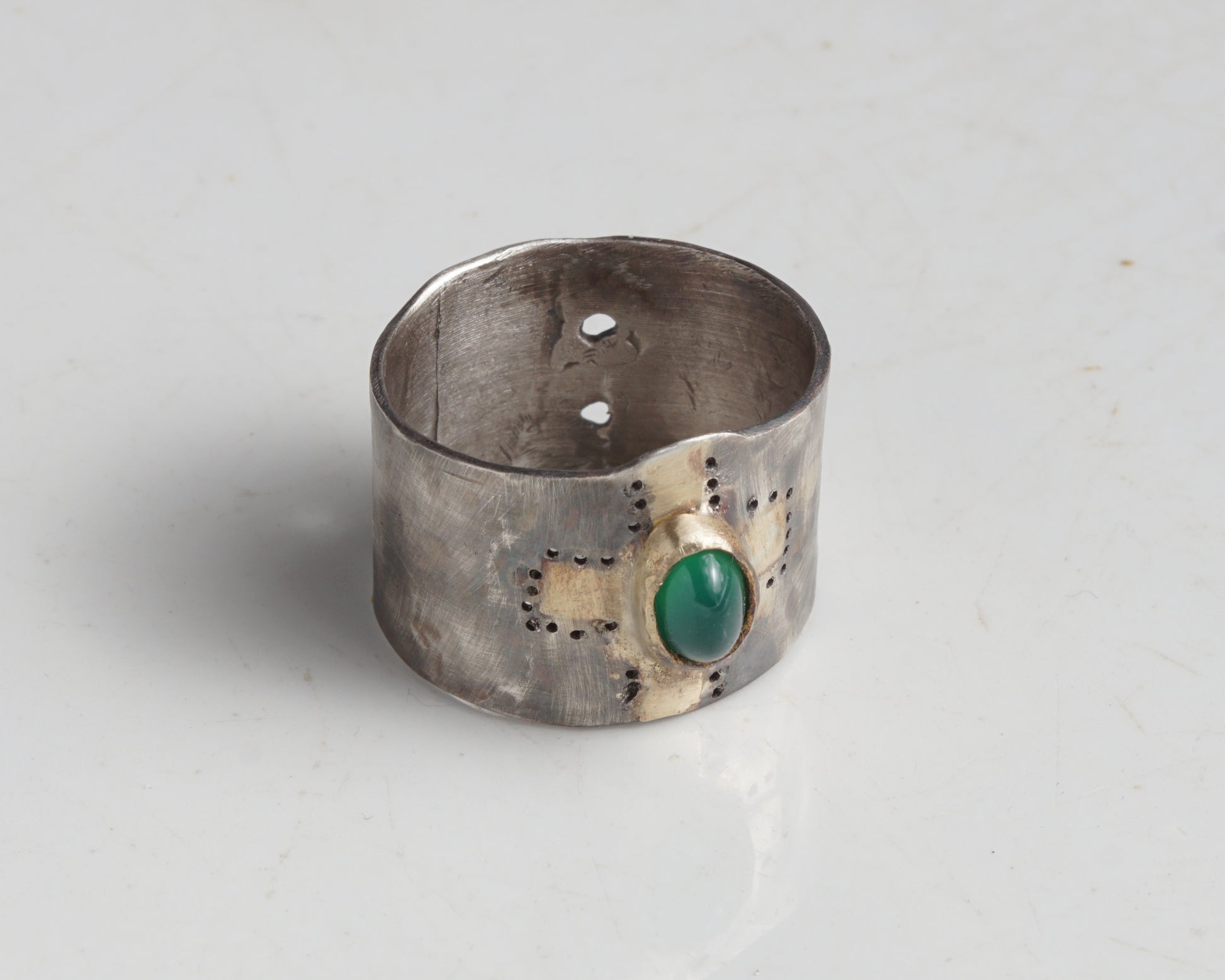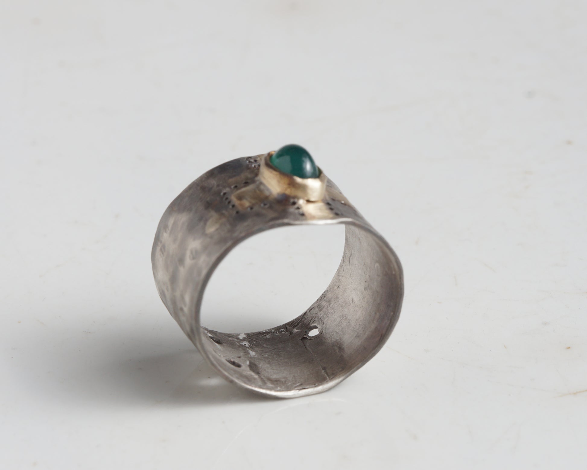 Wide band ring made of 925 sterling silver with 18k gold details and a green agate. The surface has a rich, uneven texture created by hand, with visible marks of metalwork and perforated accents. The stone is set in a gold bezel, creating contrast between oxidized silver, warm gold, and deep green agate.